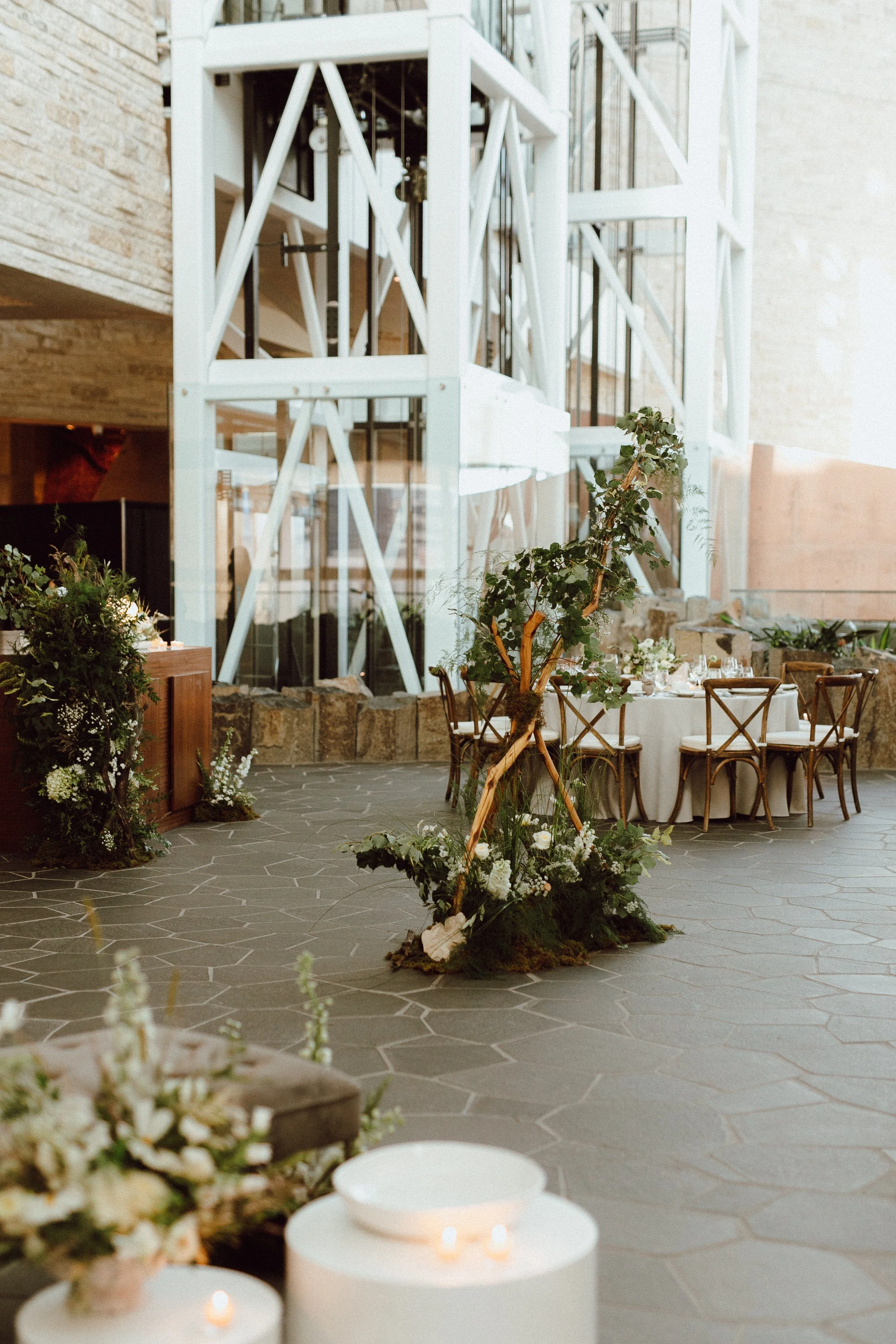 A neutral palette suited their day-to-day style, so we carried that through into their wedding. The bold geometry of the museum’s vast, glass-walled space called for a timeless look with an emphasis on delicate blooms to soften and balance the surroundings. Cassie Mae Design built free-standing floral botanical sculptures that took center stage in the reception space, inspired by some of Katherine and Kevin’s favourite art and architecture observed in their travels together.